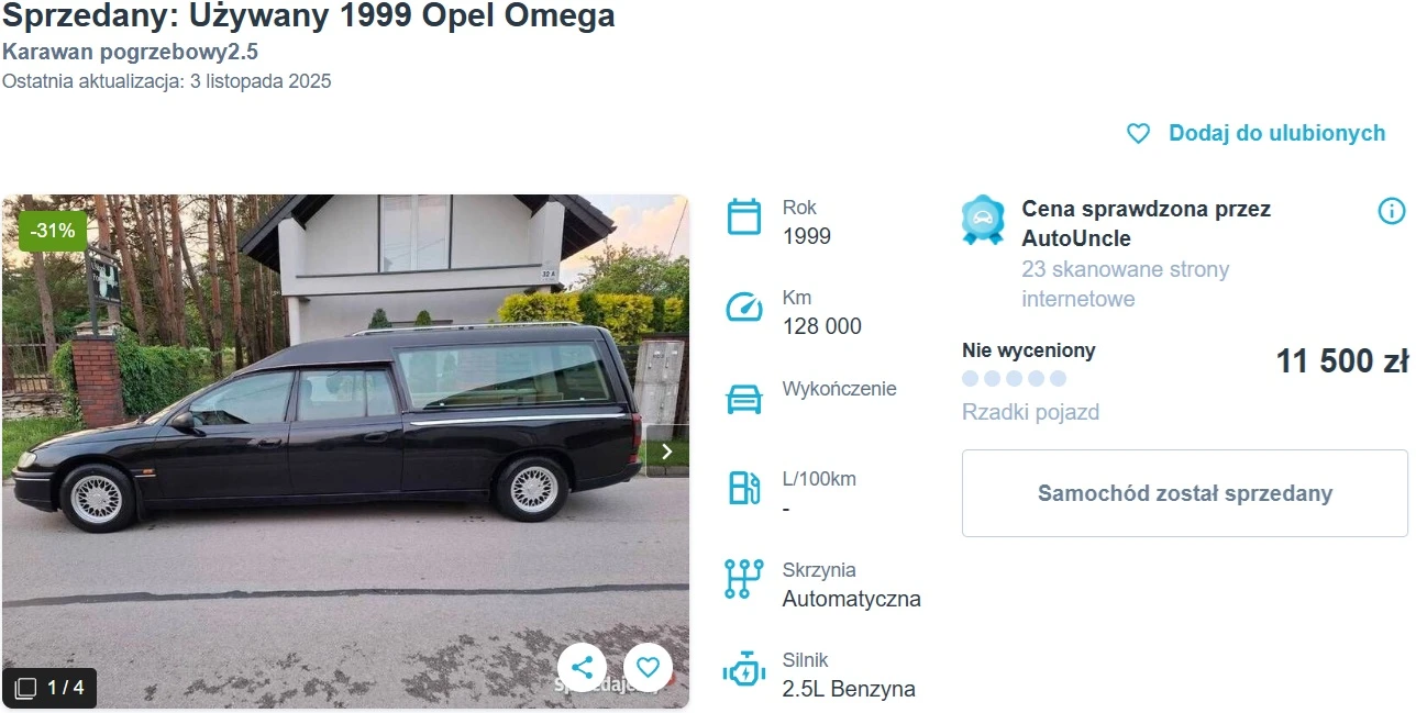 Pogrzebową Omegę wystawiono za 11 500 zł - jak na tak unikatowy w swojej istocie pojazd, w całkiem dobrym stanie (przynajmmniej wizualnym) i niedużym przebiegiem to całkiem niezła cena. Niestety, w momencie pisania artykułu, ogłoszenie Vectry na portalu sprzedajemy.pl wygasło, a na autouncle.pl widnieje adnotacja "sprzedany". Niestety, ktoś nas uprzedził - ale przynajmniej dorwał świetną okazję z idealnym samochodem na wyjazdy w Polskę na "grobbing" na przyszły rok, bo chyba pod każdym cmentarzem będzie miał zarezerwowane miejsce.