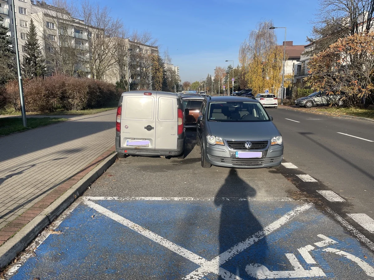 Zajmuje on dwa miejsca parkingowe, stojąc równolegle na stanowiskach prostopadłych. Jeden z jego samochodów stoi z dala od krawędzi jezdni i jest nieużytkowany od dłuższego czasu. Drugi służy do codziennej jazdy, ale wskutek zatkania dwóch miejsc zgniłym dostawczakiem powstało jedno, specjalne miejsce tylko dla niego. Zapytałem, jak można by coś z tym zrobić. Dowiedziałem się, że wskutek braku oznakowania pionowego nie można ukarać sąsiada za parkowanie równoległe na miejscach prostopadłych, ale można – za parkowanie z dala od krawędzi jezdni. Ponadto wiem już jak zgłosić nieużytkowany pojazd do odholowania. Zwracam uwagę, że te miejsca są publiczne i korzystają z nich wszyscy mieszkańcy osiedla, więc taka postawa jest bezczelnością.