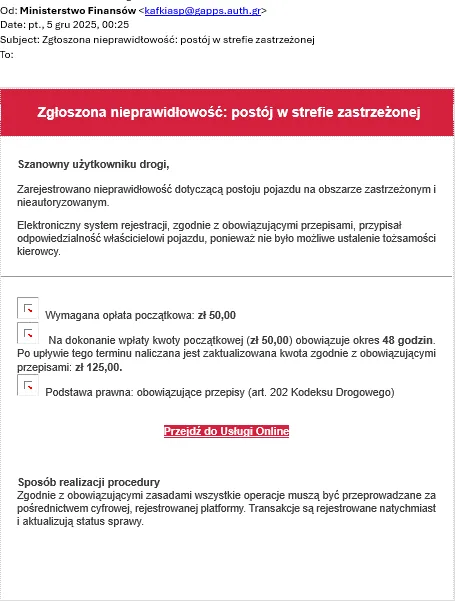 W ostatnim komunikacie resort przestrzegł kierowców przed nowym rodzajem oszustwa, które chyba najprościej nazwać „Na Ministerstwo Finansów”. Polega na tym, że na adres e-mail przychodzi wiadomość dotycząca nieprawidłowości związanej z parkowaniem w strefie zastrzeżonej. Treść e-maila mówi, że wykryto problem z postojem na obszarze zastrzeżonym i nieautoryzowanym, w związku z czym naliczono opłatę w wysokości 50 zł, która wzrośnie do 125 zł, jeśli nie opłacicie jej w ciągu 48 godzin.