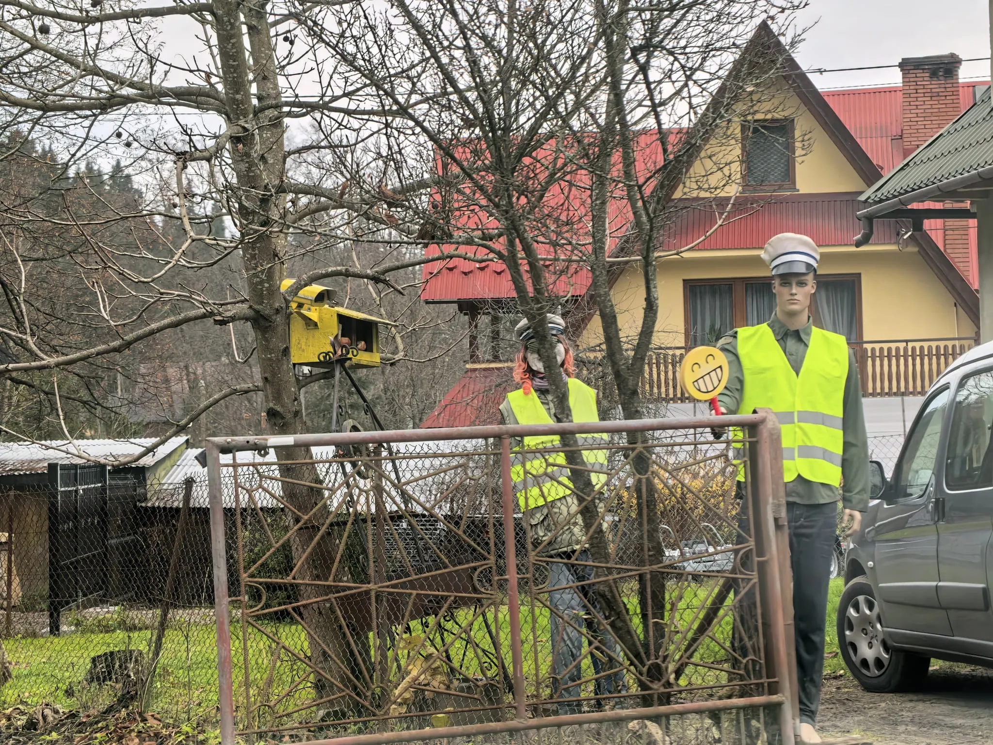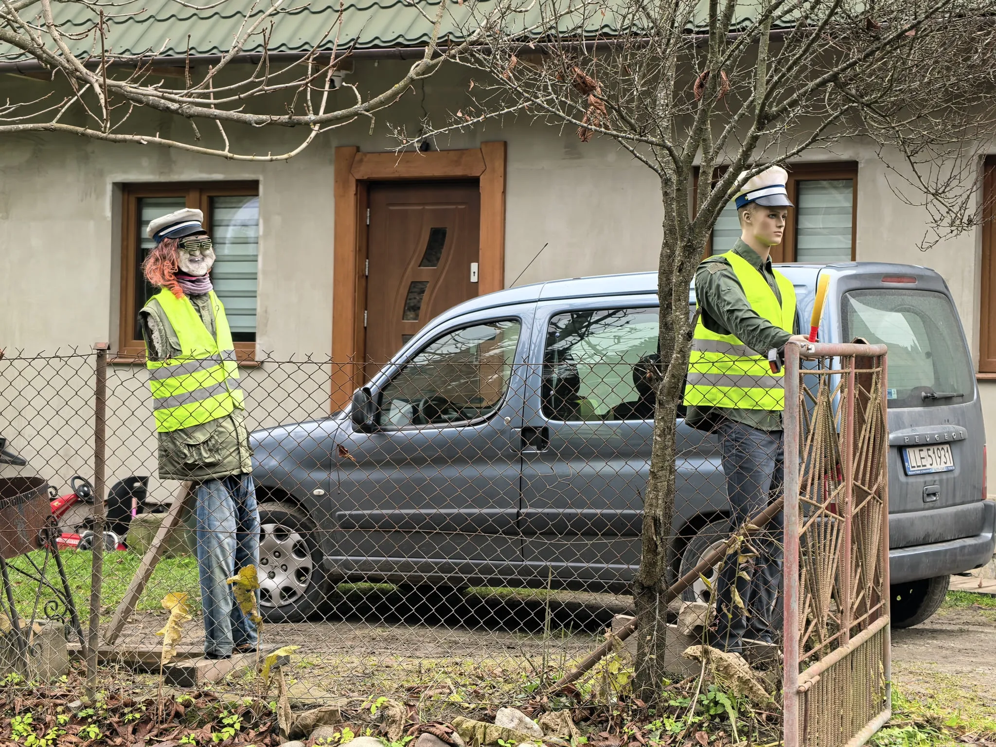 Podjeżdżacie bliżej i widzicie, że padliście ofiarą podłego żartu - to nie policjant, tylko dwa manekiny w kamizelkach i czapkach, a za nimi jest jeszcze atrapa fotoradaru.