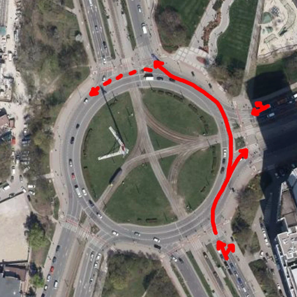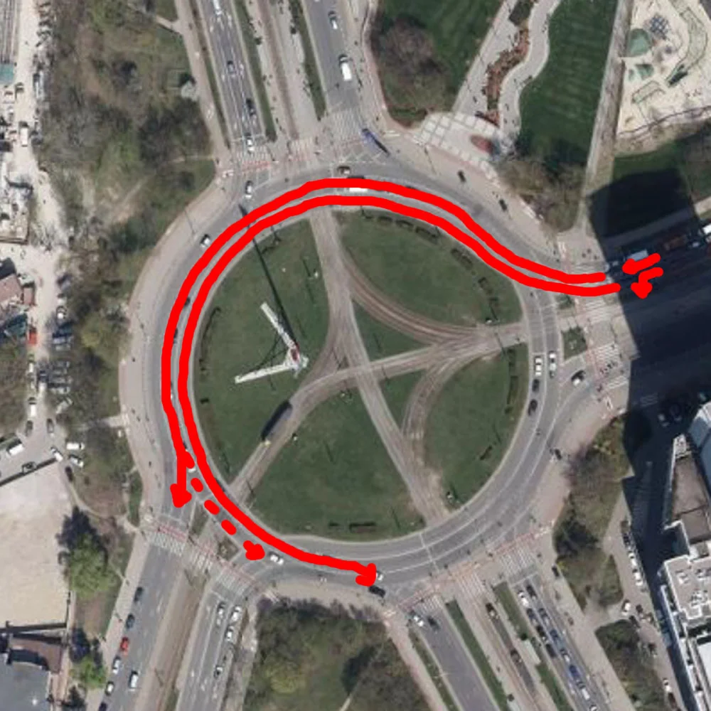 To nie jedyny przypadek, gdzie “coś się nie zgadza”, ale ten najbardziej rzuca się w oczy. Właściwie, chyba tylko południowo-zachodni wlot oznakowany jest w zgodzie z rzeczywistą organizacją ruchu - czyli jest korelacja pomiędzy znakiem F-10 a liniami na jezdni. Wystarczy popatrzeć na zdjęcie satelitarne i zestawić strzałki kierunkowe z przebiegiem pasa ruchu - nawet wodząc palcem po mapie widać, że organizacja ruchu się nie zgadza.