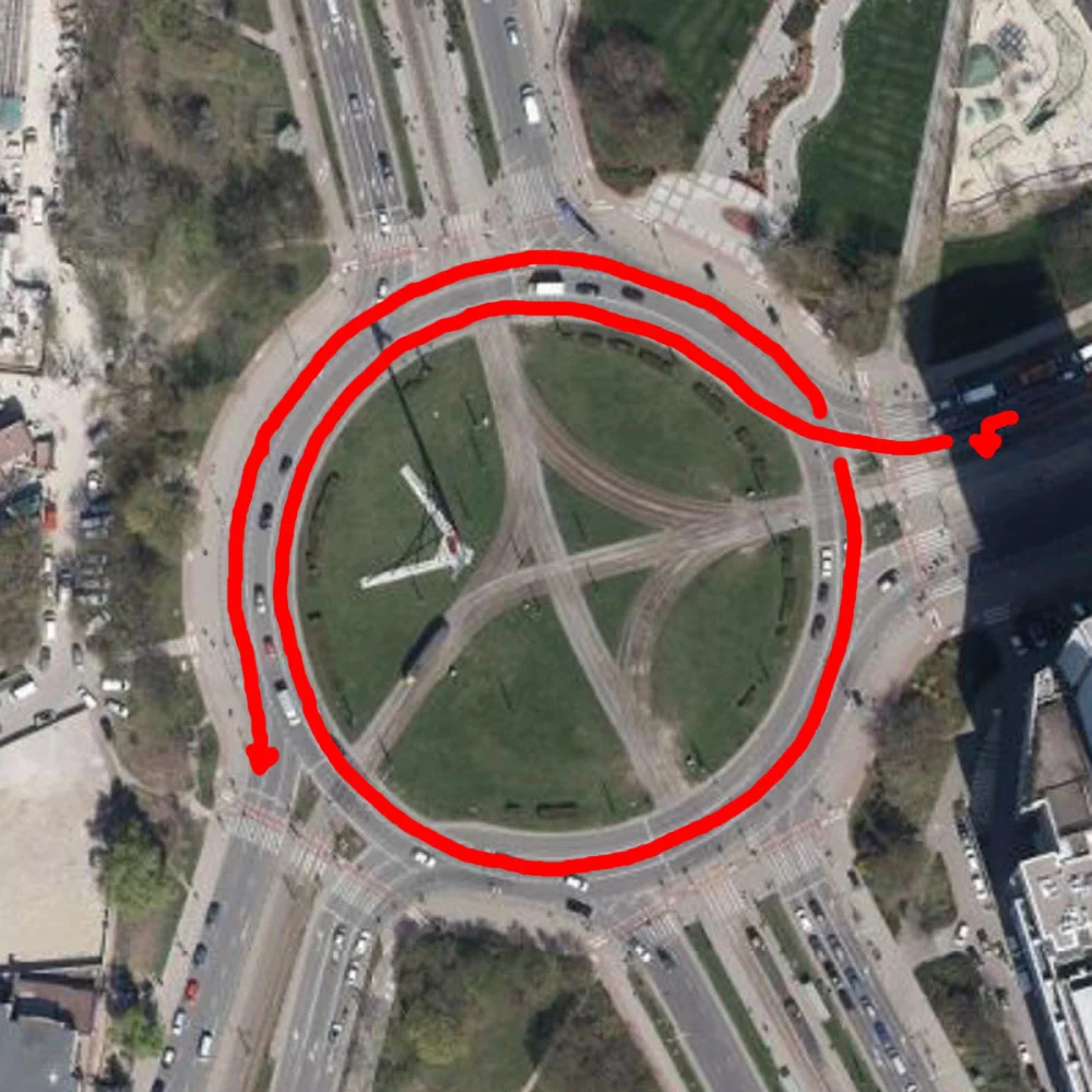 Zabawnym smaczkiem jest to, że jeżeli będę jechał jednym pasem ruchu tak długo, aż ten się po prostu skończy, wykonam jedno pełne kółko wokół ronda i zjadę bezpośrednio dopiero podczas drugiego okrążenia. I to nie tam, gdzie chciałem, a "oczko" wcześniej.