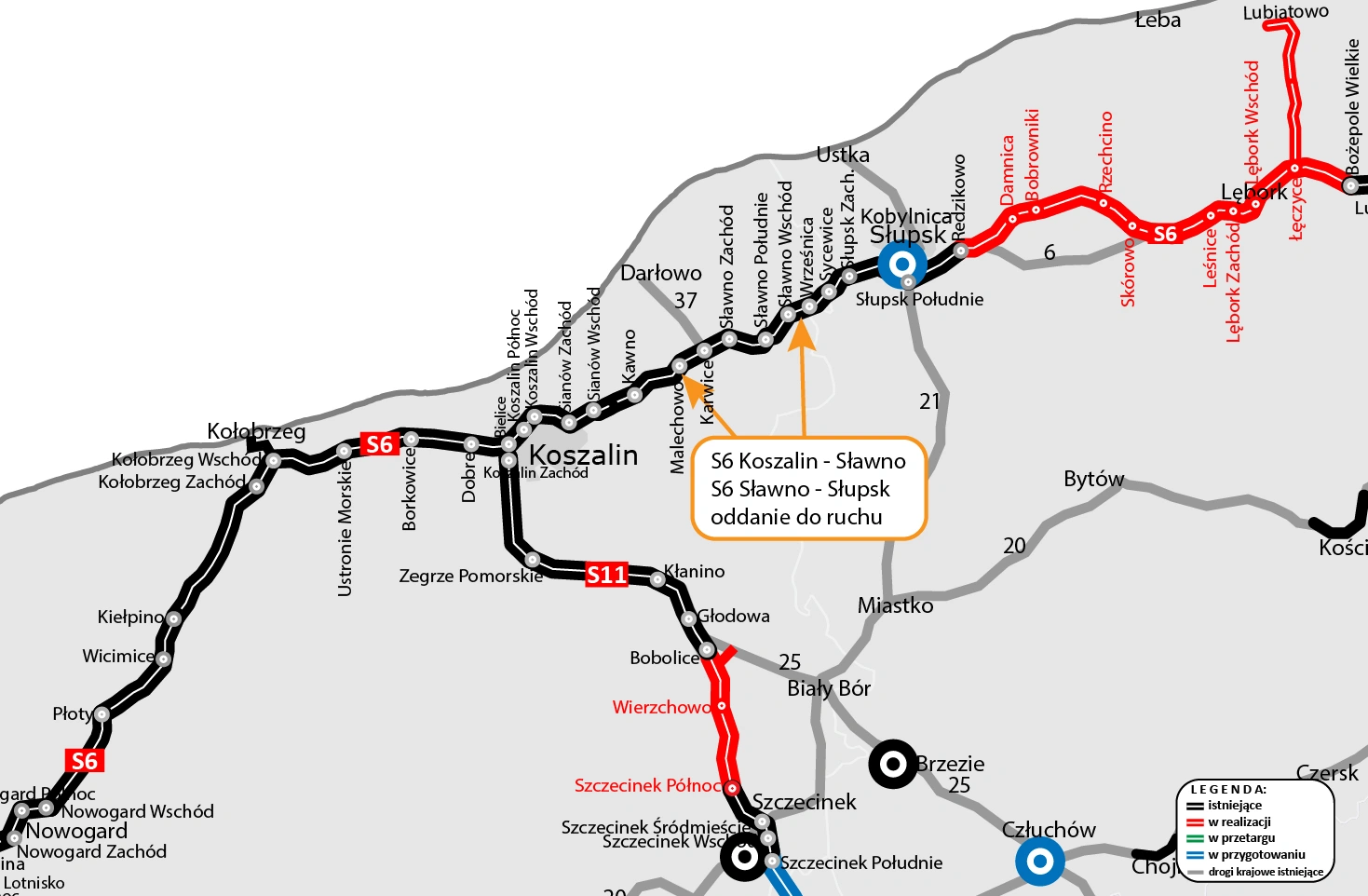 Generalna Dyrekcja Dróg Krajowych i Autostrad poinformowała, że w poniedziałek oddała do ruchu odcinek drogi ekspresowej S6 o długości 46 km. Trasa łącząca Koszalin i Słupsk składa się z dwóch pomniejszych odcinków, czyli Koszalin – Sławno (23,2 km) i Sławno – Słupsk (22,9 km). Pierwszy z nich kosztował 657,9 mln zł, a w jego skład wchodzą 4 węzły drogowe (Kawno, Malechowo, Karwice, Sławno Zachód) i 20 mostów. Budowa drugiego z nich kosztowała 701,6 mln zł. Składa się on z węzłów Sławno Południe, Sławno Zachód, Wrześnica i Sycewice, a na trasie wybudowano 21 obiektów mostowych.