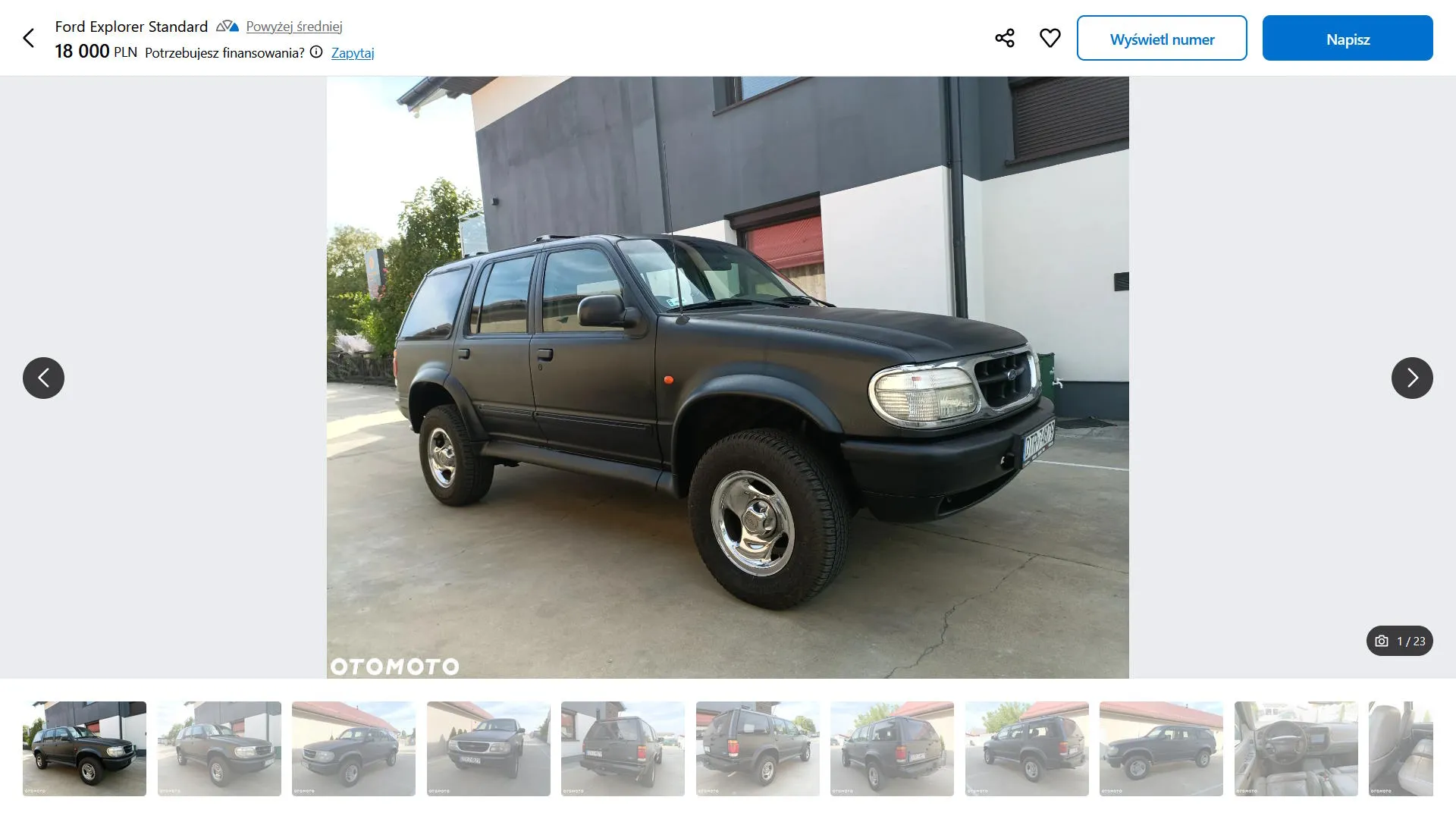 Służę uniżenie. Moją uwagę zwrócił np. ten Ford Explorer z 1996 r. za 18 tys. zł. Nie jest może jakiś super piękny (nie żeby mu czegoś brakowało, ale nie przepadam za matowymi foliami), ale sam fakt, że sprzedaje go punkt specjalizujący się w Explorerach działa moim zdaniem na korzyść tego egzemplarza.