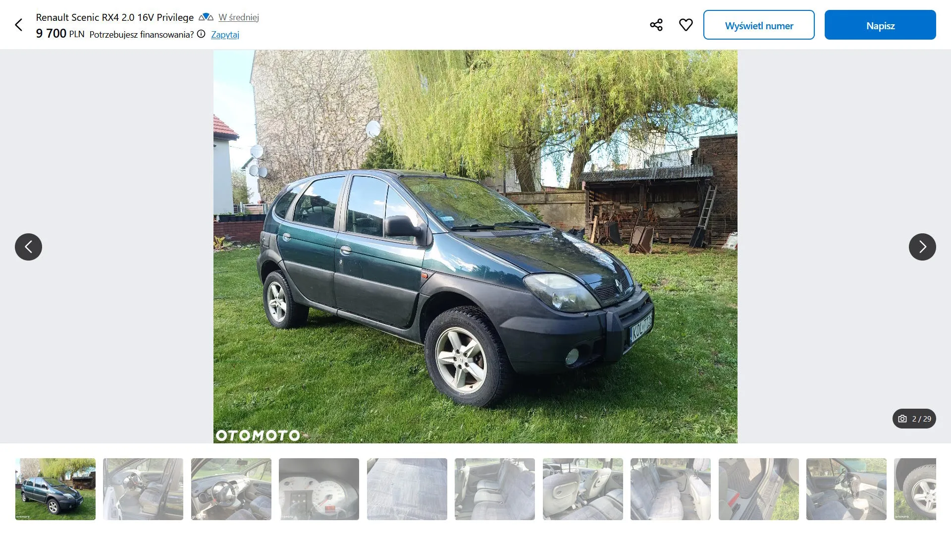 Konkretnie za to: Renault Scenic RX4 2.0 16V. Tak, oczywiście, że plik faktur na 10 tysięcy złotych budzi podejrzenia („JAK BARDZO TO JEST ZEPSUTE, SKORO WŁAŚCICIEL PO WYDANIU TAKIEJ KWOTY NIE CHCIAŁ GO ZATRZYMAĆ”), ale mimo wszystko opis i zdjęcia uznaję za wystarczająco zachęcające, by dać autu szansę. O ile dobrze kojarzę, to napęd Scenica RX4 jest o tyle problematyczny, że jak się zepsuje, to można nie mieć go jak naprawić, ale w tym przypadku napęd działa. A umówmy się: jeśli będziesz tak patrzeć na każde auto używane, to skończysz zimą na rowerze. Z napędem tylko na tył.