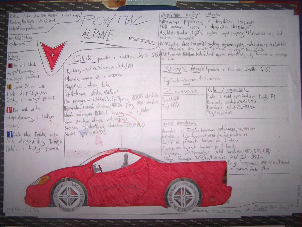 Nie wiem jak wy, ale ja swego czasu narysowałem się całkiem sporo. Ba - chciałem nawet zostać projektantem samochodów, ale przeszło mi, gdy dotarło do mnie, że projektant to jednak powinien umieć ładnie rysować, a co więcej, powinien także umieć rysować w trójwymiarze - a o sobie tego powiedzieć nie mogłem. Nawet gdy ograniczałem się do rzutów bocznych, to te rysunki jakieś rewelacyjne nie były - choć nie powiem, całkiem byłem z siebie dumny, gdy zacząłem ujmować na swoich projektach kolumny zawieszenia czy zaciski i tarcze hamulcowe - te ostatnie oczywiście obowiązkowo nawiercane. Później brałem katalog „Samochody świata” i spisywałem sobie stamtąd jakieś dane, które mi przypadły do gustu - choć gdy dziś przeglądam sobie te notatki to się za głowę łapię, co za bzdury tam wpisywałem. A niech będzie, łapcie - to mój ostatni rysunek, sprzed 20 lat.