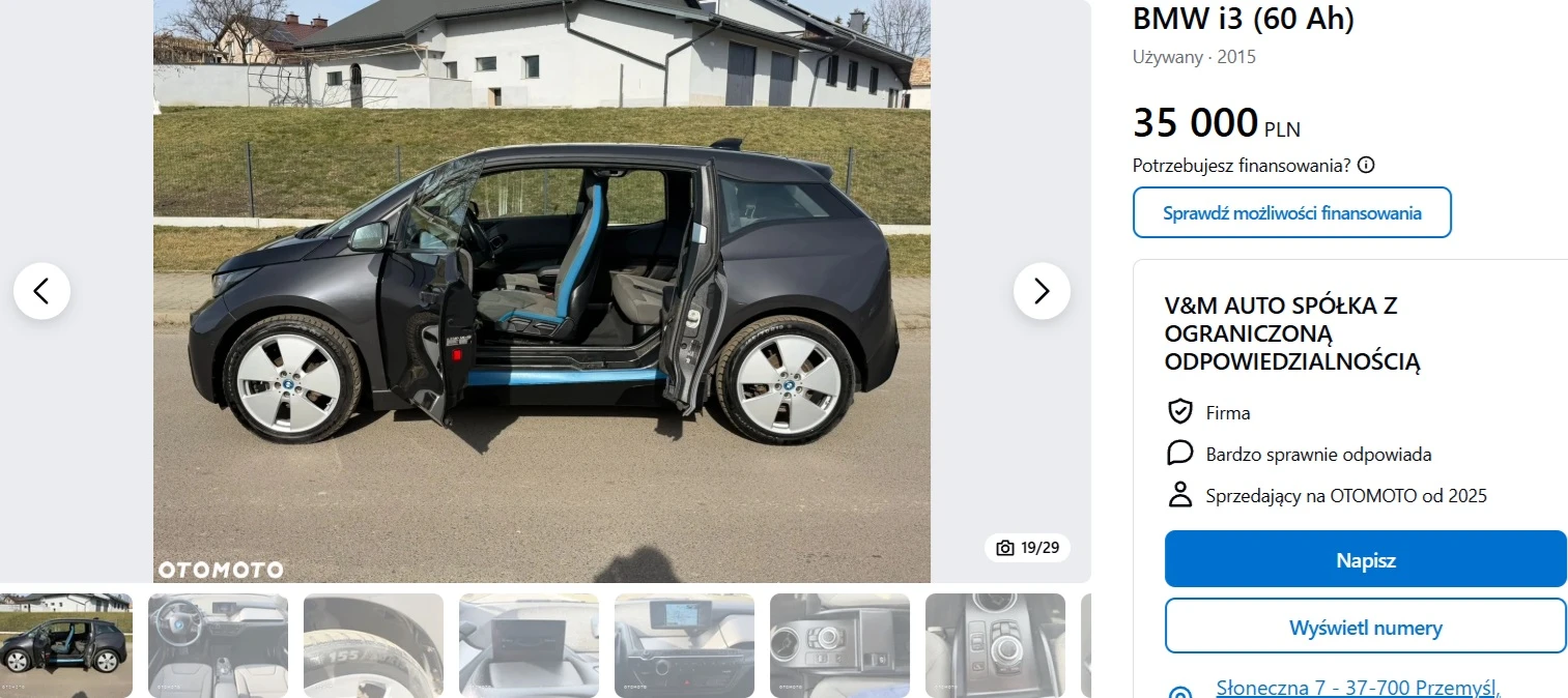 Podobnie jak umieszczony wyżej e-Golf, i3 zostało sprowadzone z kochającej elektryki Norwegii, choć już z polskimi "blachami". Ma mniejszy przebieg, mocniejszy silnik, ale nieco uboższe wyposażenie. Jest również nieco droższy, ale (przynajmniej wizualnie) zdaje się mieć to pokrycie.