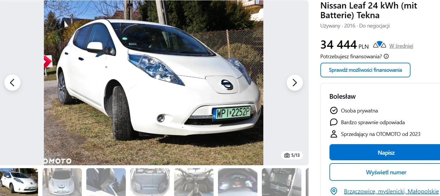Przez 10 lat auto przejechało 100 tys. km i jest w całkiem niezłym stanie. Wszystkie kilometry zrobiło w Norwegii - nawet jeszcze nie zostało przerejestrowane w Polsce. Co więcej to dość bogata wersja, z podgrzewaniem lusterek, siedzeń, czujnikami parkowania z przodu i z tyłu, czy adaptacyjnym tempomatem. Odstraszać może jedynie zasięg, który według właściciela wynosi realnie ok. 140 km.