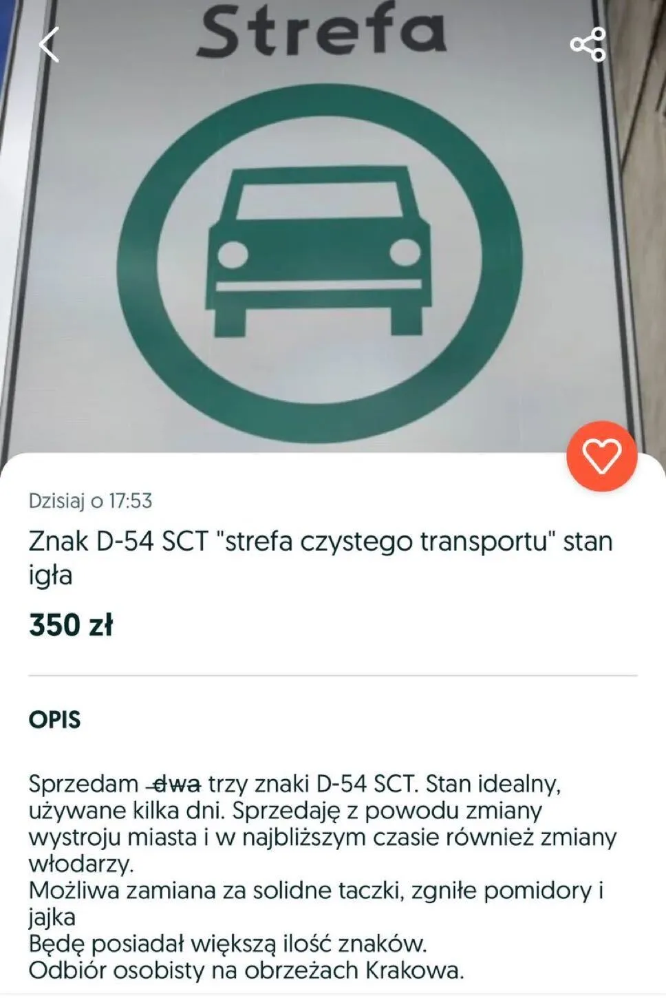 Oprócz organizacji, miejsce mają także działania "prywaciarzy". I to prywaciarzy w najczęściej używanym tego słowa znaczeniu, bowiem na portalu ogłoszeniowym OLX ktoś wystawił na sprzedaż trzy znaki, mające pochodzić z krakowskiej SCT - informuje o tym małopolskie24info.pl.