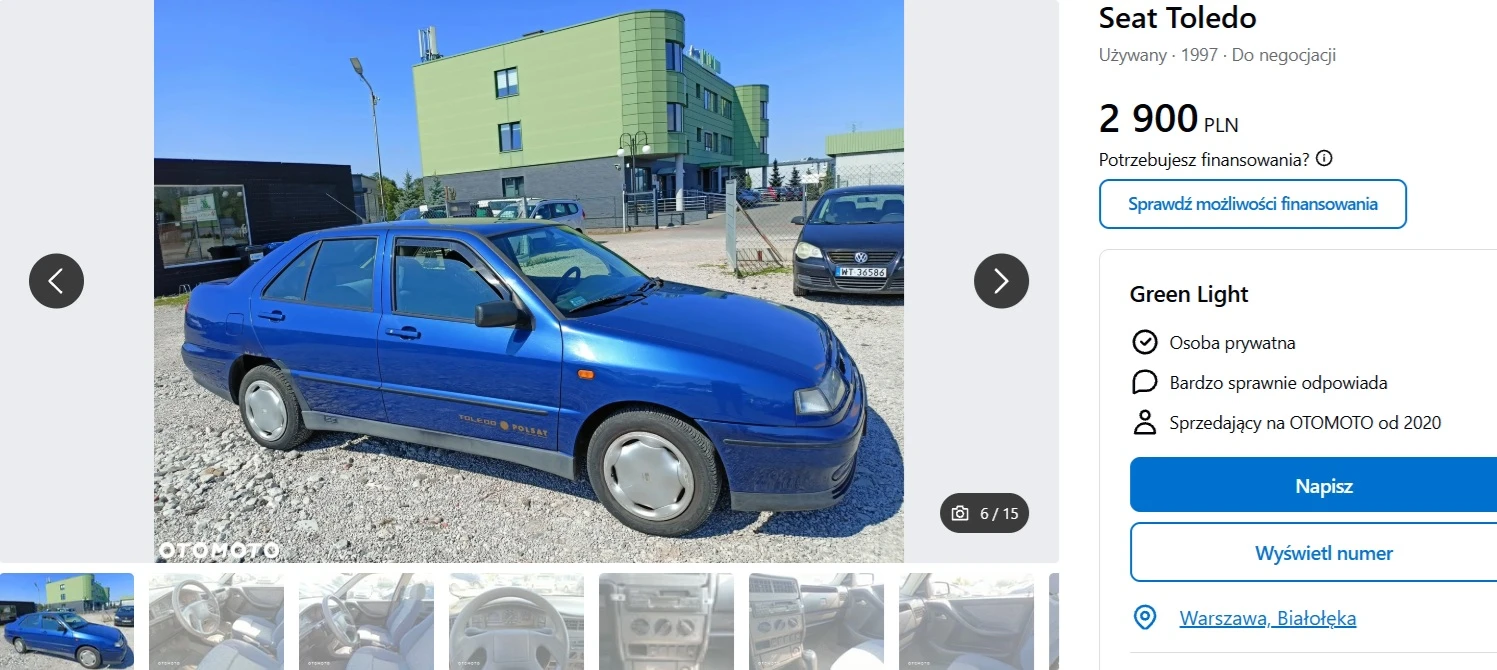 W ogłoszeniach znaleźliśmy prawdziwą perełkę popkultury lat dziewięćdziesiątych w Polsce. To Seat Toledo I generacji, w zapomnianej wersji specjalnej sygnowanej logo telewizji Polsat, powiązanej z niezapomnianymi paszportami.
