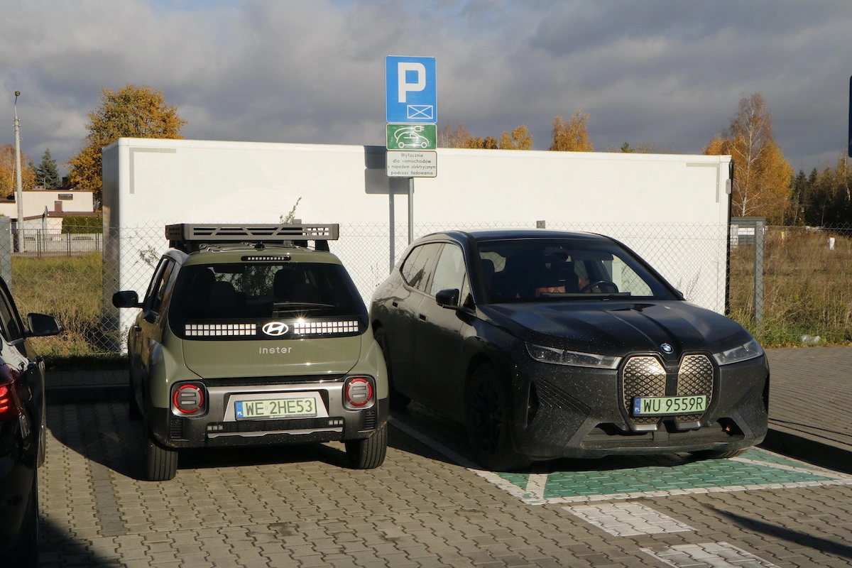 Trzeba mieć własny przewód AC Typ 2, a maksymalna moc ładowania to 11 kW. Przynajmniej była, bo kiedy przyjechałem, to ktoś właśnie zaparkował elektryczne BMW iX na miejscu do ładowania, ale nie zaczął go ładować, tylko sobie poszedł. Próbowałem stanąć obok i podłączyć Hyundaia Instera, okazało się jednak że nie posiadam stosownego przewodu. W tym samym czasie zaczepił mnie młody człowiek, mówiący, że jest dziennikarzem, który przygotowuje materiał o tej ładowarce. Odpowiedziałem więc, że jesteśmy konkurencją i na tym się nasza interakcja skończyła. W tym czasie przyszedł nieznany mi mężczyzna i na stacji ładowania nakleił kartkę „NIECZYNNE AWARIA”, skutecznie kończąc krótką historię tego miejsca.