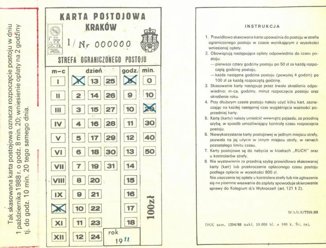 Karta Postojowa działa z grubsza tak, że należało w niej zakreślić miesiąc, dzień, godzinę i minutę rozpoczęcia parkowania. Małym druczkiem na dole również i rok, na wypadek jakby komuś do głowy przyszło kombinowanie i wrzucanie przeterminowanej karty z nadzieją, że kontroler nie zauważy. Wypełniona karta na końcu lądowała za szybą samochodu, aby możliwe było jej odczytanie z zewnątrz.