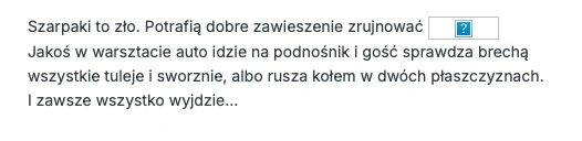 Jest to wartość dla stacji kontroli pojazdów w Warszawie, więc podejrzewam że na wsi ten odsetek jest jeszcze mniejszy. Jeśli już otrzymują wynik negatywny, to właśnie często za zawieszenie, które na polskich drogach zużywa się szybciej niż w krajach Europy Zachodniej. Przeważnie są to jednak usterki łatwe w naprawie i niespecjalnie drogie, pomijając może samochody z górnej półki z układami pneumatycznymi czy hydropneumatycznymi. Badanie na szarpaku to słuszna metoda sprawdzania, czy zaraz nam coś nie odpadnie, bo niektóre luzy nie są ani wyczuwalne na kierownicy, ani nie powodują charakterystycznego stukania. Nawet jednak na polskich forach i grupach regularnie spotyka się pogląd, że szarpaki niszczą zawieszenie. Te same osoby potem odpalają wóz na zimno, dają od razu ognia żeby się szybciej nagrzał, a na dziurach pogłaśniają radio.