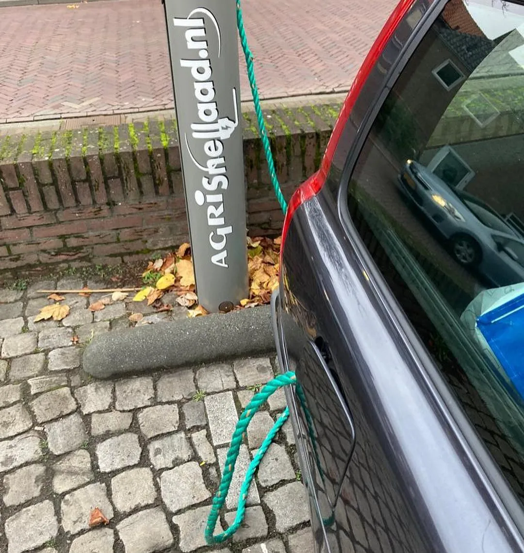 W różnych częściach świata samochodem elektrycznym wciąż można czasami zaparkować za darmo w centrach miast na czas ładowania. Z pewnością to właśnie z tego przywileju próbował skorzystać kierowca Volvo w holenderskim Middelburgu, gdzie lokalni stróże prawa zetknęli się z powyższą sceną. Właściciel wiekowej V70-tki próbował udawać, że jego pojazd ładuje się za pomocą liny przymocowanej do korka wlewu paliwa i stacji ładującej.