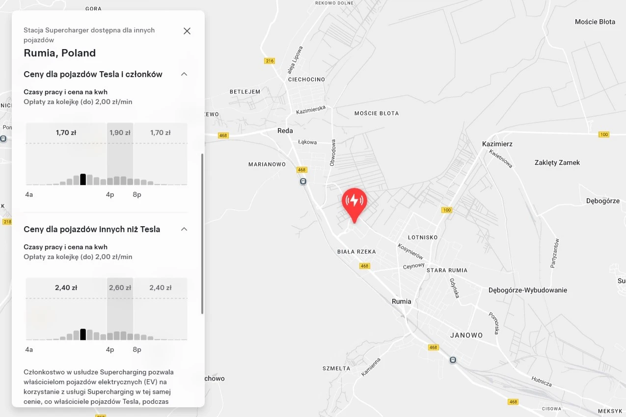 W poprzednim tygodniu Tesla przeprowadziła test swoich Superchargerów, udostępniając je użytkownikom innych samochodów elektrycznych w Polsce. Dwie stacje ładowania znajdujące się na ul. Grunwaldzkiej 108 w Rumii i ul. Alei Krakowskiej 61 chwilowo wyświetlały się w aplikacji jako dostępne dla wszystkich marek, a następnie zniknęły. Przy okazji pojawiły się też ceny ładowania. W Rumii było to 2,40–2,60 zł/kWh, gdzie kierowcy Tesli zapłaciliby 1,70–1,90 zł/kWh. Z kolei w Warszawie stawki dla innych marek samochodów to 2,30 zł/kWh w ciągu dnia i 1,30 zł/kWh w nocy. Tymczasem dla właścicieli Tesli to kolejno 1,60 zł/kWh i 1 zł/kWh.