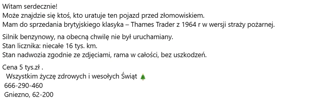 Przed Świętami ludzie pozbywają się gabarytów. Niedawno po sieci krążyła techniczna Skoda 706 RT, teraz amatora szuka coś jeszcze bardziej niszowego. Na sprzedaż wypłynął pożarniczy Thames Trader T55 z 1964 roku.