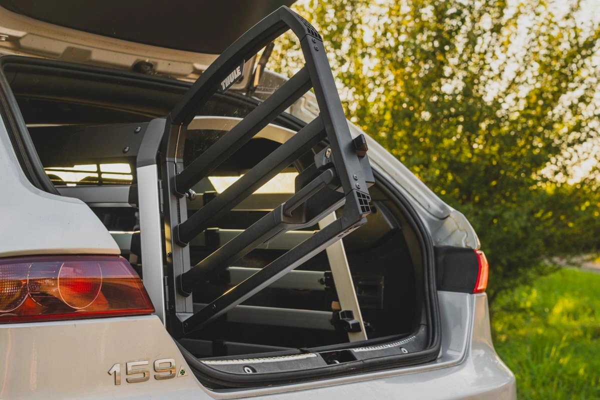 Niestety bagażnik w mojej 159 SW niespecjalnie zachęcał w ogóle do poszukiwań klatki. Otwór załadunkowy - wąski i to w każdym wymiarze. Próg? Wysoki jak diabli. Sufit? Niziutko. Kiedy zresztą dostałem propozycję testu pierwszej wersji Thule Allax, poszedłem szybko na podjazd, zerknąłem na mój bagażnik, wróciłem do komputera i odpisałem "sorry, ale chyba niezbyt".