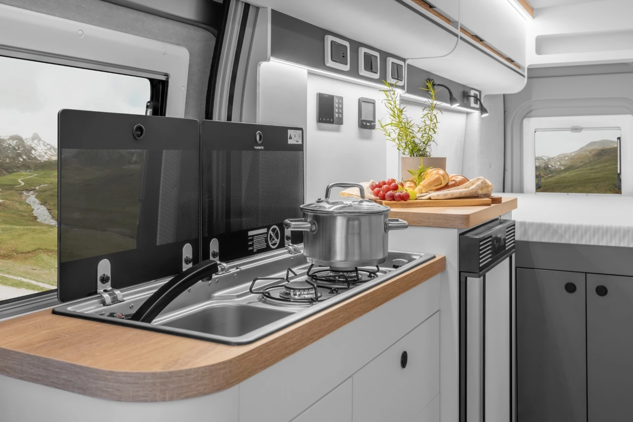 W części mieszkalnej znajdziemy kabinę prysznicową, zintegrowaną toaletę, 90-litrową lodówkę, oraz dwupalnikową kuchenkę gazową. Izolowany zbiornik wody czystej pomieści 100 l, a zbiornik wody szarej - 75 l. Dla komfortu cieplnego auto wyposażono w ogrzewanie gazowe Truma Combi 4E, a na potrzeby nowoczesnych urządzeń akumulator mieszkalny LiFePO4 o pojemności 135 Ah.