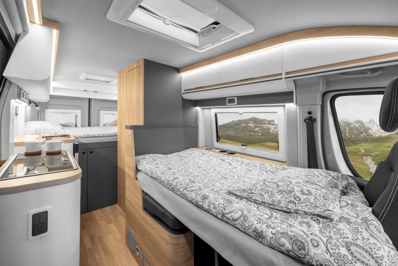 W krótszej odmianie tylne łóżko ma wymiary 190x140 cm, a rozkładane przednie łóżko 170x90 cm. W dłuższej wersji łóżka mają wymiary odpowiednio 193x71 cm i 181x74 cm. Dla tych, którzy skrzykną większą ekipę na wyjazd na Mazury, w obu wariantach dostępne jest także opcjonalnie trzecie łóżko w podnoszonym dachu o wymiarach 200x120 cm. Zaś dla wygody podczas jazdy, fotele w przednim rzędzie są obrotowe, a z tyłu jest dwuosobowa kanapa.