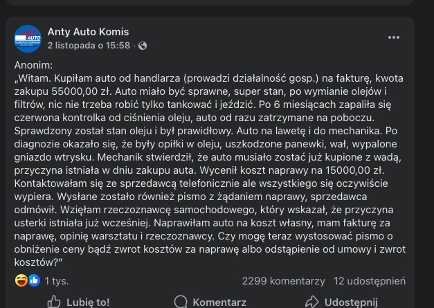 Po przeczytaniu opisu tej sytuacji straciłem ochotę na sprzedawanie jakichkolwiek samochodów używanych. Nabywczyni, która uszkodziła silnik po pół roku jazdy przychodzi do sprzedawcy z żądaniem zwrotu kosztów naprawy. Świat stoi na głowie.
