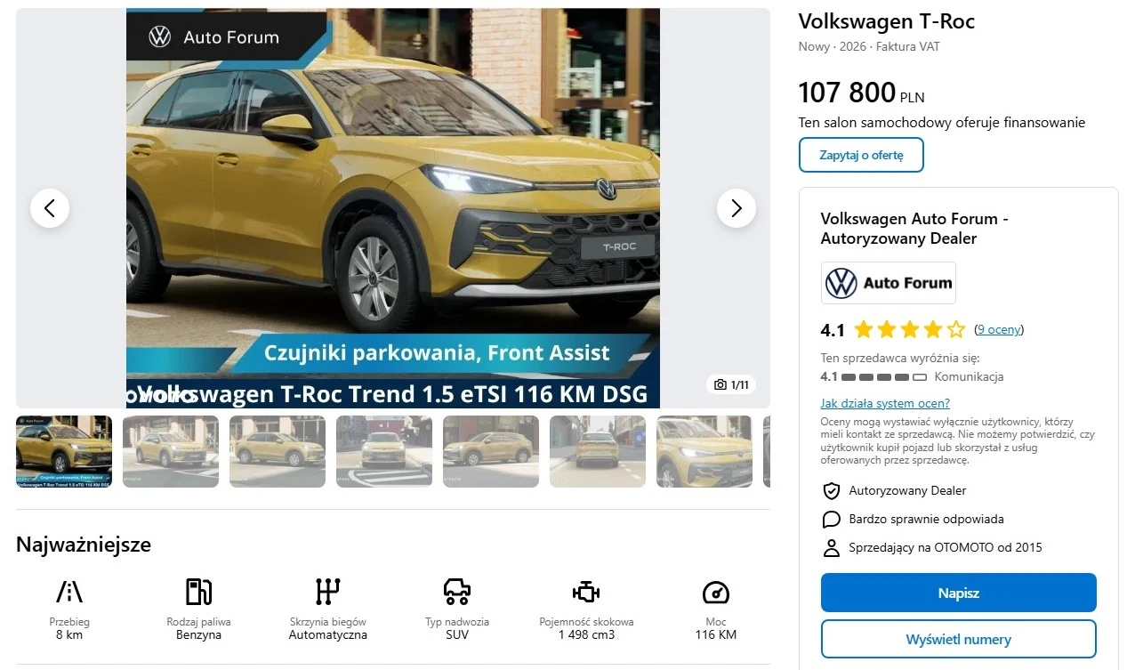 Wystarczy bowiem przejrzeć serwisy ogłoszeniowe, które często oferują nowe samochody z placu lub po prostu swoje własne promocje. Kilka kliknięć wystarczyło, by znaleźć Volkswagena T-Roca w tej samej wersji wyposażenia Trend kosztującego 110 800 zł. To oznacza, że zamiast 11 000 zł możecie zaoszczędzić 19 590 zł, jeśli wybierzecie salon w Płocku. Dodam, że auto ma 8 km przebiegu i zjechało z linii produkcyjnej w tym roku. Może to tędy droga?
