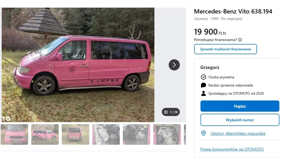Od driftowania i dużej dawki adrenaliny może dojdziecie do wniosku, że warto wyjechać w Bieszczady i spędzić wspólny weekend na łonie natury. Jeśli macie niecałe 20 000 zł, możecie wybrać się na małe wakacje różowym Mercedesem Vito. Z tyłu jest sporo miejsca, więc spokojnie zmieści się kilka walizek z outfitami waszej drugiej połówki i może nawet będzie gdzie spać. Na dachu umieszczono panel solarny, a w tylnej szufladzie znajduje się baniak mieszczący 12 litrów wody. Takie Vito raczej nie będzie głównym autem w rodzinie, ale małym kosztem i kroczek po kroczku można zrobić z niego niezłego kampera, który pomoże odpocząć od codziennego zgiełku i zostanie w rodzinie na stałe.