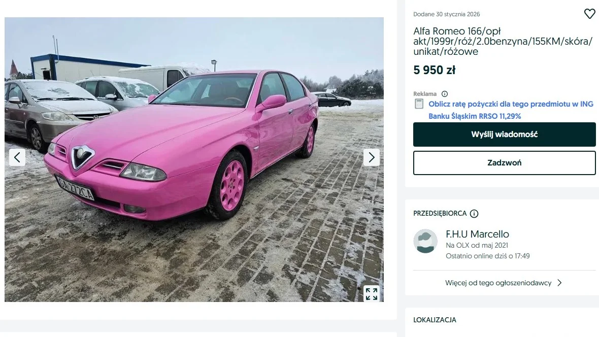 Przeprowadzka zaliczona, więc pora poznać nową okolicę. Może w nowym mieście jest jakiś teatr albo dobra restauracja? W roli wozu, który zawiezie was na romantyczny wieczór, chyba nic nie sprawdzi się lepiej od stylowej włoskiej Alfy Romeo 166. A po spektaklu lub kolacji przy świecach wsiądźcie do auta, odpalcie włoską muzykę i jedźcie prosto przed siebie na nocną przejażdżkę. Egzemplarz z ogłoszenia kosztuje 5950 zł. Może jeszcze coś utargujecie – raczej nie ma tragedii.