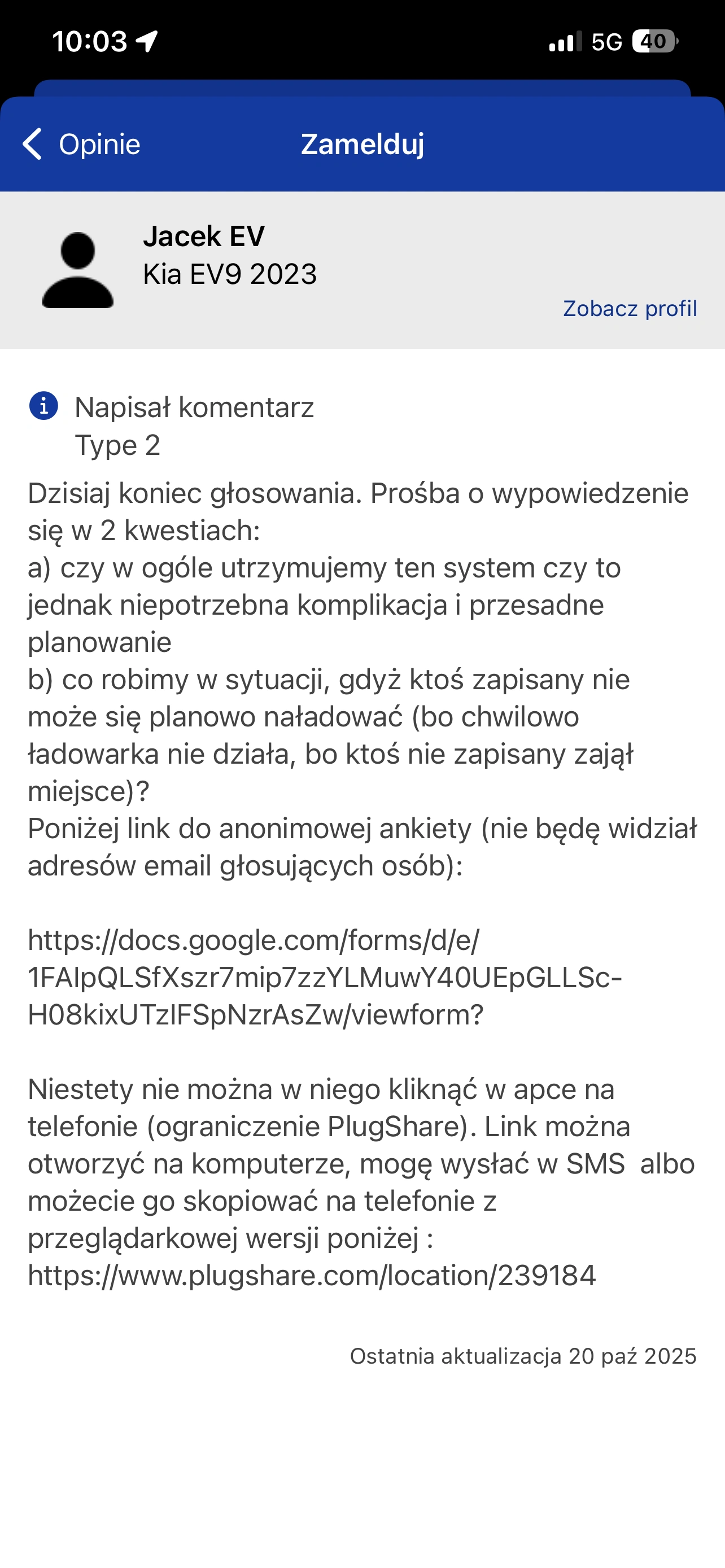 Chętni na ładowanie zamiast do zeszytu wpisują się do aplikacji Plugshare, która kiedyś była podstawą do poruszania się po kraju z raczkującą infrastrukturą w zakresie ładowania. To dzięki niej mogliśmy znaleźć wszystkie ładowarki, a do tego feedback użytkowników pozwalał omijać te uszkodzone lub szemrane. Dodatkowo użytkownicy wpisywali ile czasu zajmie im ładowanie, więc można było planować postoje. Z czasem sława aplikacji trochę przeminęła, bo sieć ładowania się rozrosła, a samochody same potrafią wybrać najlepszą dostępną ładowarkę. Okazuje się jednak, że ta aplikacja jest świetnym zeszytem kolejkowym.