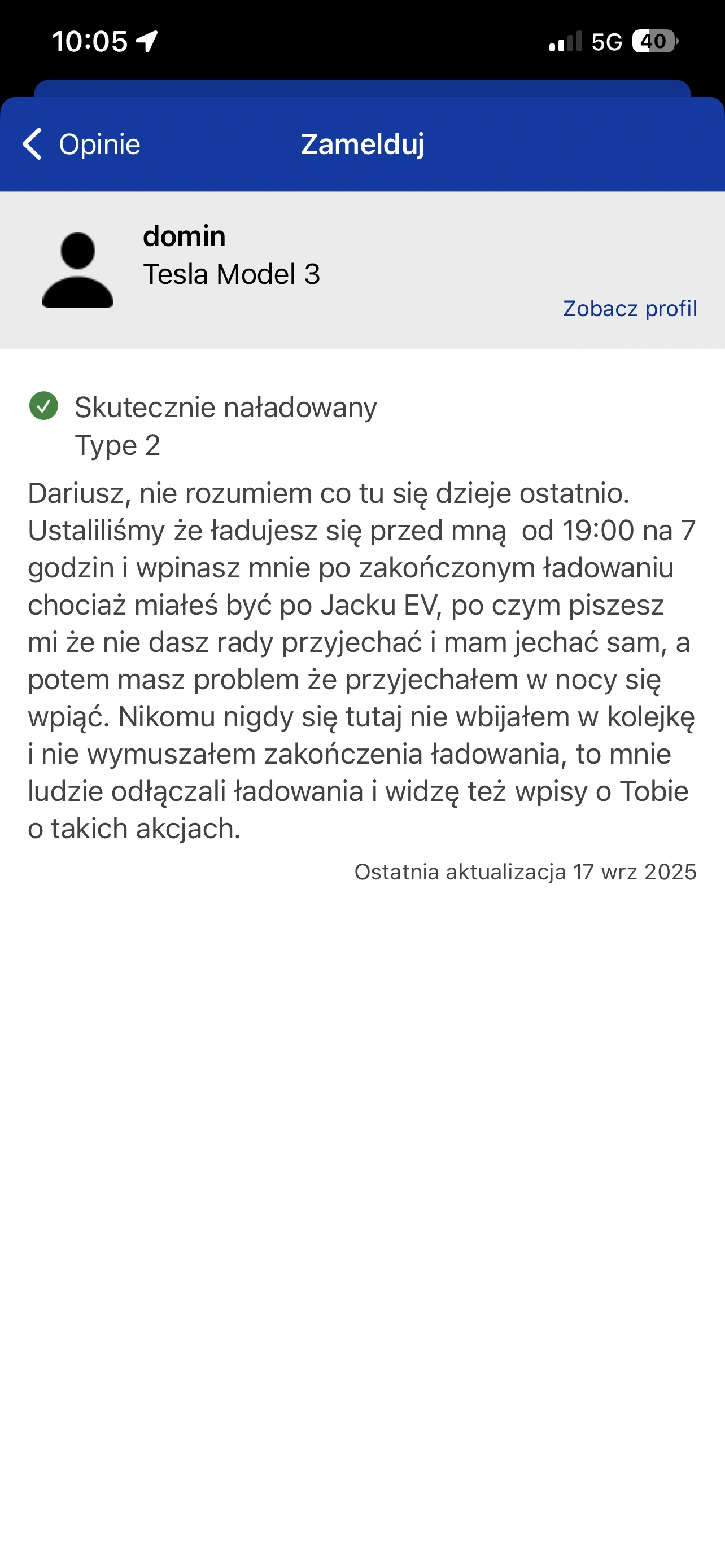 Tak, dobrze widzicie - w aplikacji wprowadzono zapisy na ładowanie. Wszystko jest zapisane, widać, kto na ile może przyjechać i ile godzin spędzi pod ładowarką, więc można sobie zaplanować swoje życie na kilka dni do przodu. Wiemy, że Jacek przyjedzie ładować we wtorek wieczorem, więc nie możemy wtedy stać na ładowarce. Cudowny jest ten system, ale najwidoczniej budzi trochę kontrowersji.